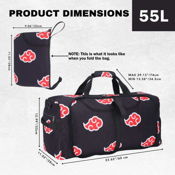 ANIME GYM BAG: This foldable duffel is designed for maximum convenience and durability. Made with abrasion-resistant and water-resistant materials, it’s ready for any adventure—whether you’re hitting the gym, traveling, or going on a weekend trip. Its spacious 55L capacity easily holds up to 30 items, while its multi handy pockets ensure everything stays organized. It even has a dedicated shoe compartment! The padded top handle and detachable shoulder strap provide comfort and versatility, making it the perfect companion for any journey. When you’re done, fold it down for easy storage!
